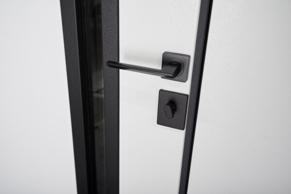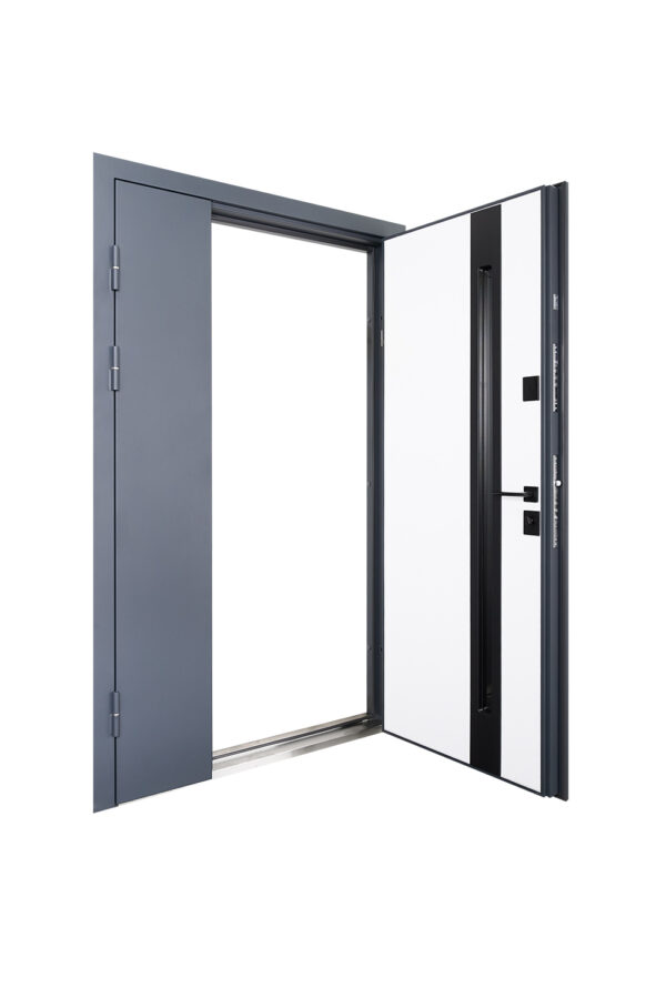 Коробка товщиною 135 мм також утеплена мінеральною ватою, а її металевий торець зашитий для додаткової міцності та захисту від вологи. Поліуретановий термоущільнювач і три контури ущільнення забезпечують герметичність дверей, що особливо важливо для використання у вуличних умовах.