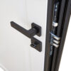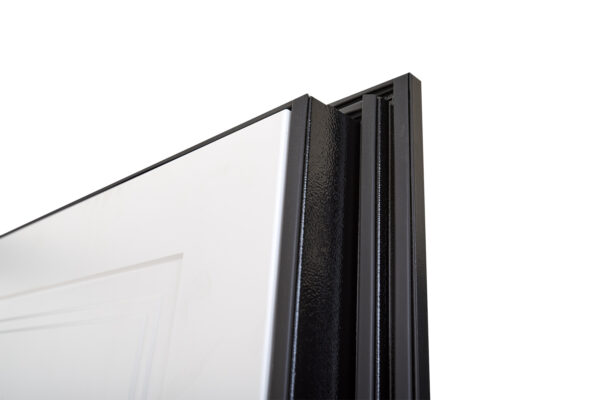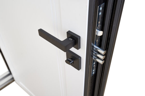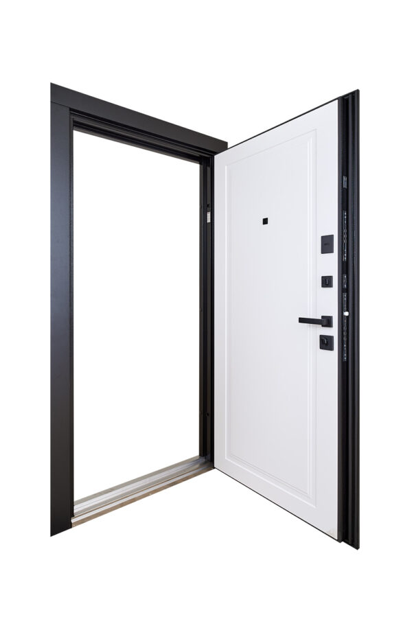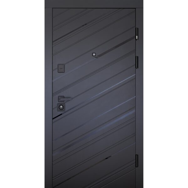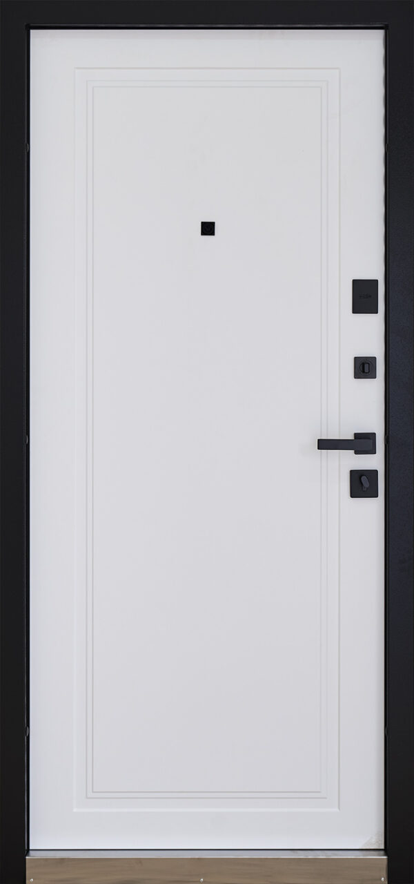 Зовнішнє оздоблення дверей виконано у стилі чорна шагрень — це універсальний колір, що пасує до будь-якого фасаду. Внутрішнє покриття — елегантний білий супермат, який гармонійно вписується в сучасний інтер’єр.