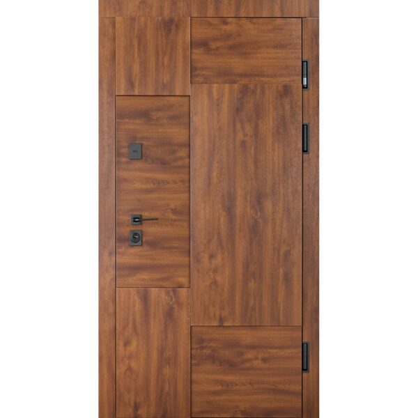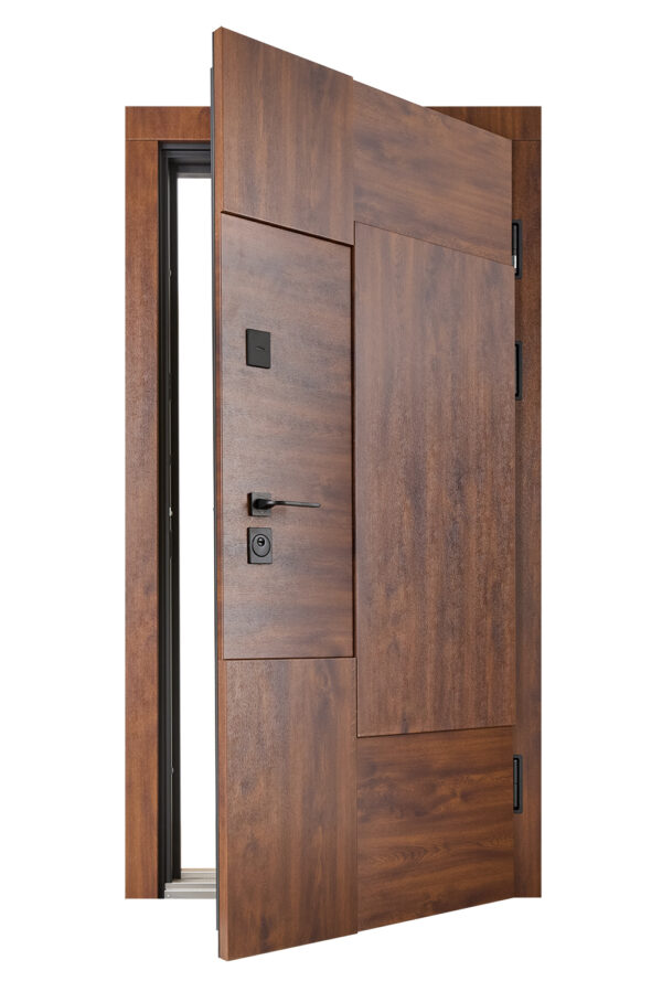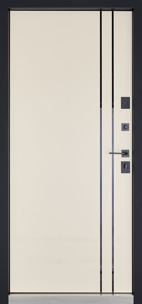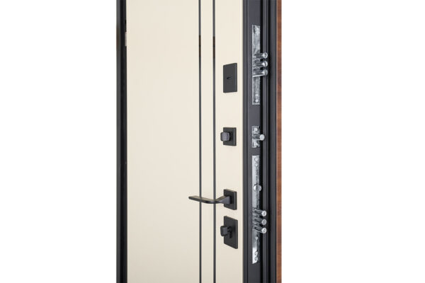Модель оснащена двома замками KALE 257: сейфовий (верхній) та циліндровий (нижній), що гарантують надійний захист від зламу. Разом з циліндром CORDON (або аналогом), чорними квадратними броненакладками, захисними металевими карманами для замків та нічним засувом, двері створюють ефективну багаторівневу систему захисту.